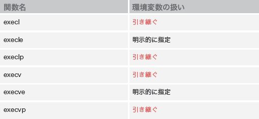 変化する際に呼び出すexec関数には表-3に示すとおり複数の種類があり、今回の脆弱性において鍵となる環境変数の扱いが異なっています。呼び出し時に明示的に環境変数を指定しないexec関数においては、親プロセスから子プロセスに引き継がれた環境変数が、そのまま実行対象のプロセスへ変化した後も使用されます。