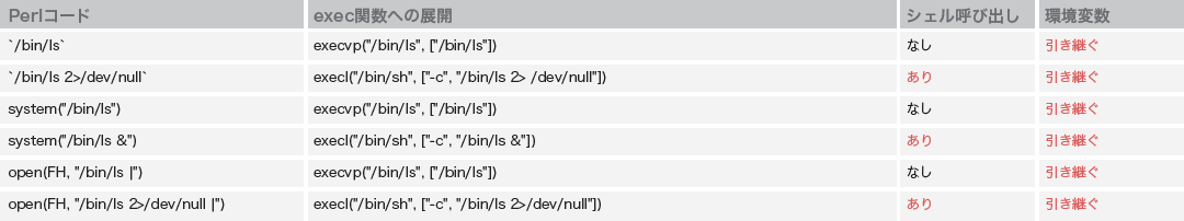 また、スクリプト言語においてはプログラムの記述方法により、意図せずにシェルが呼び出されてしまうこともあります。スクリプト言語の例としてPerl(※54)における動作を示したものが表-4です。このように、同一の関数による呼び出しであっても、引数次第で暗黙的にシェル経由の呼び出しへ展開されてしまいます。環境変数はすべて引き継がれていますので、シェル経由の呼び出しへ展開される場合は、今回の脆弱性の影響を受けます。