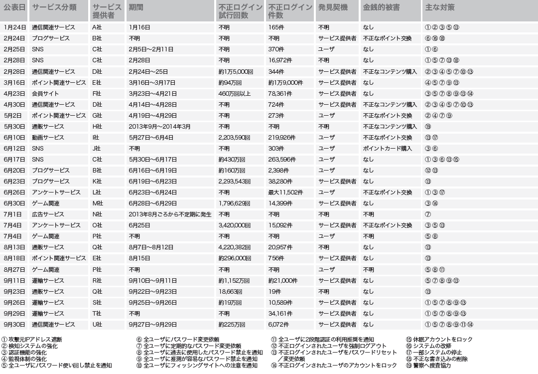 表-5は2014年1月1日から9月30日の間にリスト型攻撃として公表されたインシデントをまとめたものです。ほぼ毎月どこかのサービスがリスト型攻撃を受け、不正にログインされていることが分かります。金銭的被害も9件発生しており、クレジットカードで大量のチケットを購入し、換金する事例や、友人の名を騙ってメッセージを送り、ポイントカードを購入させる事例、他にもサービス独自のポイントをギフト券などへ不正に交換する事例などが発生しています。リスト型攻撃の発見の契機については、サービス提供者による発見数13件、ユーザによる発見数9件となっています。サービス提供者自身もリスト型攻撃に気がついていない状況が多くあることが窺えます。