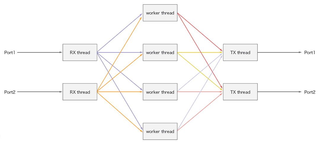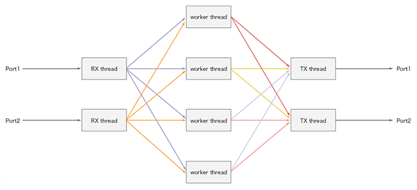 Lagopusのデータプレーンは、パケットI/Oを担当するスレッドとOpenFlow処理を担当するスレッドが分かれています。更に、I/Oは受信(RX)と送信(TX)に、OpenFlow処理(worker)は複数のスレッドとなるよう起動時に指定が可能です。これらのスレッドは、それぞれ他の処理が割り当てられないよう別々のコア上で動くよう固定させることで、性能を確保しています。また、スレッド間の通信には、DPDKが提供しているロック処理不要のリングバッファを用いています。