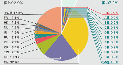 攻撃元の分布としては、多くの場合、国内、国外を問わず非常に多くのIPアドレスが観測されました。これは、IPスプーフィング(※25)の利用や、DDoS攻撃を行うための手法としてのボットネット(※26)の利用によるものと考えられます。
