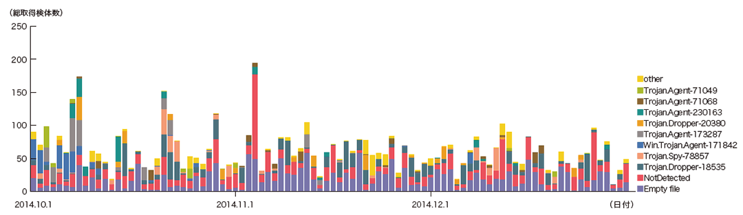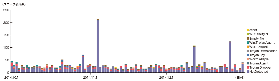 本レポート期間中、Confickerを含む1日あたりの平均値は、総取得検体数が16,343、ユニーク検体数は557でした。短期間での増減を繰り返しながらも、総取得検体数で99.6%、ユニーク検体数で97.0%を占めています。このように、今回の対象期間でも支配的な状況が変わらないことから、Confickerを含む図は省略しています。本レポート期間中の総取得検体数は前回の対象期間と比較し、約36%と大幅に減少しています。また、ユニーク検体数は前号から約17%減少しました。Conficker Working Groupの観測記録(※38)によると、2015年1月13日現在で、ユニークIPアドレスの総数は890,845とされています(※39)。2011年11月の約320万台と比較すると、約28%に減少したことになりますが、依然として大規模に感染し続けていることが分かります。