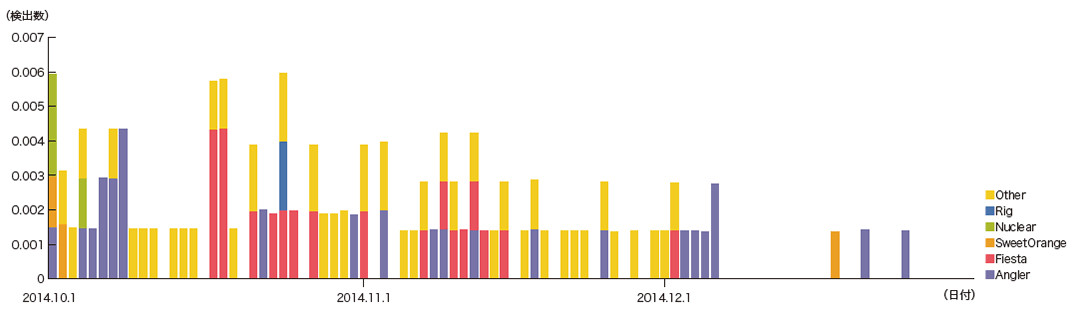 2014年10月から12月の期間に観測されたドライブバイダウンロードは、7月から9月の期間に比べて約3分の1程度に減少しました(図-12)。特に12月は攻撃を観測しない日が多くなっています。攻撃の内訳は前回から続くAnglarと、今回急伸したFiestaによるものが大勢を占めています。Fiestaは他の多くのExploit Kitと同様にInternet Explorerやそのプラグイン、Flash、Java、Silverlightの脆弱性を悪用する機能を備えています。なお、AnglarやFiestaを含む多くのExploit Kitの最近の傾向として、複数の比較的新しいFlashの脆弱性(CVE-2014-8439、CVE-2014-0515、CVE-2014-0497など)を悪用する機能を速いペースで追加していることが挙げられます(※42)。逆に、従来多く狙われてきたJavaの脆弱性を悪用する機能はあまり見られなくなりました。これは、2014年に、Internet Explorerにバージョンの古いJavaの自動実行を遮断する機能が追加されたことや、ChromeやFirefoxではJavaの自動実行そのものが遮断されたことなど、各種のブラウザ環境において、Java関連のセキュリティ機能が改善されてきたためと考えられます。