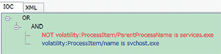 図-16はPyIOCeの画面の一部です。ユーザはこの画面上でvolatilityのterm(項目)を定義していきます。図ではProcessItem/ParentProcessNameとProcessItem/nameの2つのtermがAND/ORのロジックで組み合わされて定義されています。図のようにNOT(否定)を指定できるほか、大文字小文字の区別、マッチングの指定(※58)なども可能です。