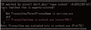 OpenIOC 1.1ではparameterという概念を使い、termごとにメタデータを定義することができます。openioc_scanはそのparameterを用いて、スコアリングでの評価をサポートしています。例えば、先の例のIOCを評価した際、片方のtermのみ真であっても、parameterとして定義したスコアが閾値を超えている場合、そのスコアに基づきIOCにマッチしたことが表示されます。具体的には、parameterにセットされていたscoreが整数値で合計100を超える場合、図-18のように該当するIOCが表示されます。openioc_scanはそのほかにdetailやnoteというparameterをサポートしています(※61)。