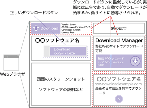 図-13 ダウンロードサイトに混入した偽ダウンロードボタン(広告)の例