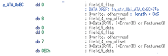 また、nls_933w.dll内に存在する、ATAデバイスのレジスタの読み書きに用いる6バイトの構造体から成るバイナリシーケンスを定義することも、nls_933w.dllに特化した検出であれば有効です。この構造体は、レジスタオフセットや書き込むデータなどで構成され、例えばHDDの情報を取得するためのコマンド(IDENTIFY DEVICE)の場合、図-17のように2つの構造体(合計で12バイト)のバイナリシーケンスとしてメモリ上に存在しています。その他にもATAコマンドを含む構造体がモジュールに数多く含まれているので、それらをANDで組み合わせて定義します。一方ドライバの側にはこのような構造体は含まれていませんが、その構造体をパースするコードシーケンスを定義するのも1つの手でしょう。