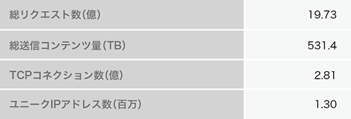 2014年の夏の甲子園のストリーミング配信のアクセス規模を表した数値を表-1に示します。ここで示した数値は、大会の全期間において、全Webサーバのアクセスログを対象として算出しています。総リクエスト数は先程紹介したアクセスログの行数と同じです。総送信コンテンツ量は、アクセスログに記録されているプレイリストとセグメントファイルの各コンテンツのファイルサイズを合計した値です。実際にコンテンツがWebサーバから送信されるときは、HTTP、TCP、IPなどの各プロトコルのヘッダーも送信されるため、実際にWebサーバから送信されたデータ量は総送信コンテンツ量よりも多くなります。