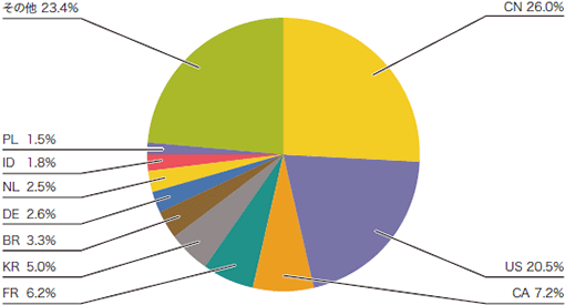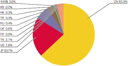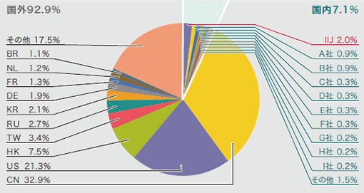 図-7 検体取得元の分布(国別分類、全期間、Confickerを除く)