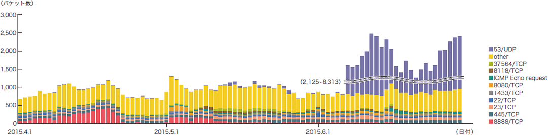 2015年4月から6月の間に観測したbackscatterについて、発信元IPアドレスの国別分類を図-3に、ポート別のパケット数推移を図-4にそれぞれ示します。