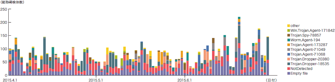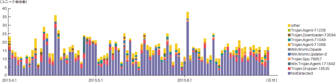 本レポート期間中、Confickerを含む1日あたりの平均値は、総取得検体数が27,999、ユニーク検体数は549でした。短期間での増減を繰り返しながらも、総取得検体数で99.7%、ユニーク検体数で97.0%を占めています。このように、今回の対象期間でも支配的な状況が変わらないことから、Confickerを含む図は省略しています。本レポート期間中の総取得検体数は前回の対象期間と比較し、約44%増加し、ユニーク検体数は前号から約10%減少しました。総取得検体数の増加は、本レポートの期間中、米国に割り当てられたIPアドレスからの感染活動が増加したためです。Conficker Working Groupの観測記録(※38)によると、2015年7月1日現在で、ユニークIPアドレスの総数は775,060とされています。2011年11月の約320万台と比較すると、約24%に減少したことになりますが、依然として大規模に感染し続けていることが分かります。