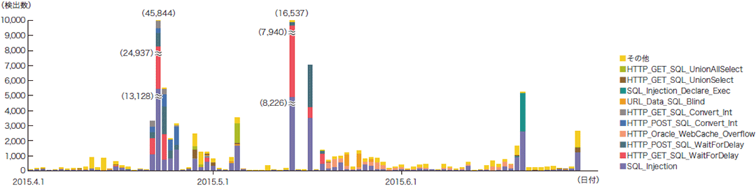 IIJでは、Webサーバに対する攻撃のうち、SQLインジェクション攻撃(※39)について継続して調査を行っています。SQLインジェクション攻撃は、過去にもたびたび流行し話題となった攻撃です。SQLインジェクション攻撃には、データを盗むための試み、データベースサーバに過負荷を起こすための試み、コンテンツ書き換えの試みの3つがあることが分かっています。