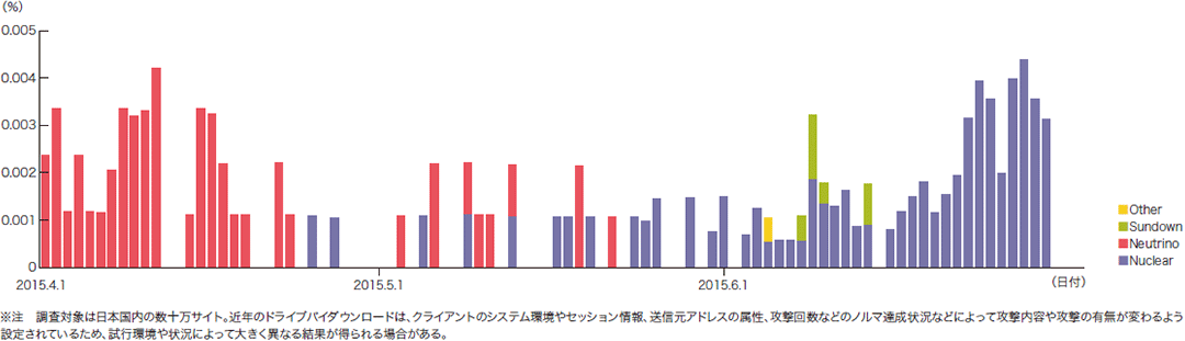 2015年4月から6月の期間に検知されたドライブバイダウンロードは、2015年1月から3月の期間の2倍以上に増加しています。前半はNeutrinoが多く観測されましたが、後半はほとんどNuclearへとシフトしています(図-12)。また、6月中旬の一時期、Sundownという新たなExploit Kitを検知しました。Sundownは特に日本国内のユーザを対象とした攻撃に用いられており(※41)、MITFにおける観測時には、CVE-2015-0311やCVE-2015-0313などのFlashの脆弱性を悪用して最終的にKasidetなどのマルウェアのダウンロードが発生したことを確認しました。