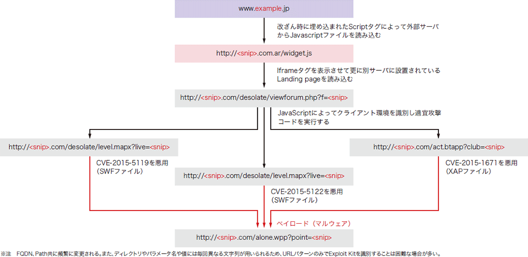 本稿執筆時点(2015年7月下旬)に観測されているAnglerの典型的なURL遷移の例を示します(図-18)。この例では、改ざんされたWebサイト内のHTMLコンテンツに、外部のJavaScriptファイルを読み込むScriptタグが挿入されており、そのファイルから更に別のサーバ(Infector)に設置された、悪意あるJavaScriptを含むHTMLファイル(以下「Landingpage」とする)を読み込ませます(※46)。