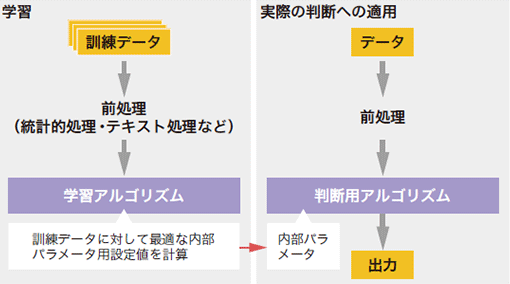 実際の問題に適用するにあたっては、対象となる問題とデータを分析して、それに合った機械学習アルゴリズムを選択し、そのアルゴリズムが学習・判断しやすいように入力の前処理(統計的処理、テキスト処理など)を実装する必要があります。