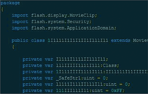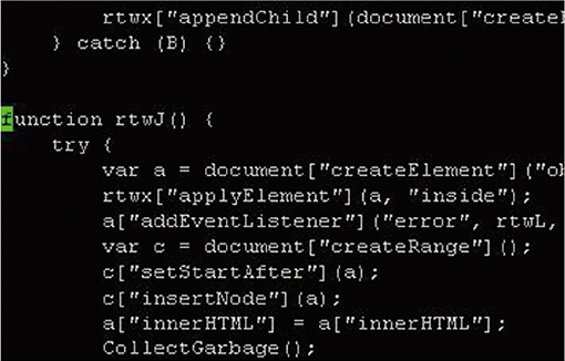 また、このLanding pageには、IEのリソース情報漏えいの脆弱性(CVE-2013-7331/MS14-052)などを悪用して仮想化環境やアンチウイルスソフトウェアなどを検知する仕組みを備えており(※47)、それらが見つかった場合は以降の攻撃は行われません。対象としている仮想化環境やアンチウイルスソフトウェアが検知されなかった場合、IEのメモリ破損の脆弱性(CVE-2014-4130/MS14-056)の悪用を試みたり、AdobeFlashの脆弱性(CVE-2015-5122、CVE-2015-5119、CVE-2015-3113など)を悪用するSWFファイルや、WindowsのTrueTypeフォント解析の脆弱性(CVE-2015-1671)を悪用するXAPファイルなどの実行を試みたりします(図-20)。これらのExploitコンテンツも難読化されており、表層的な解析では内容を把握することが困難です(図-21、図-22)。