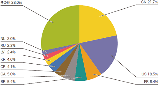 図-3 DDoS攻撃のbackscatter観測による攻撃先の国別分類