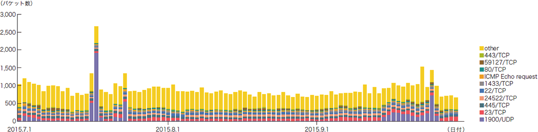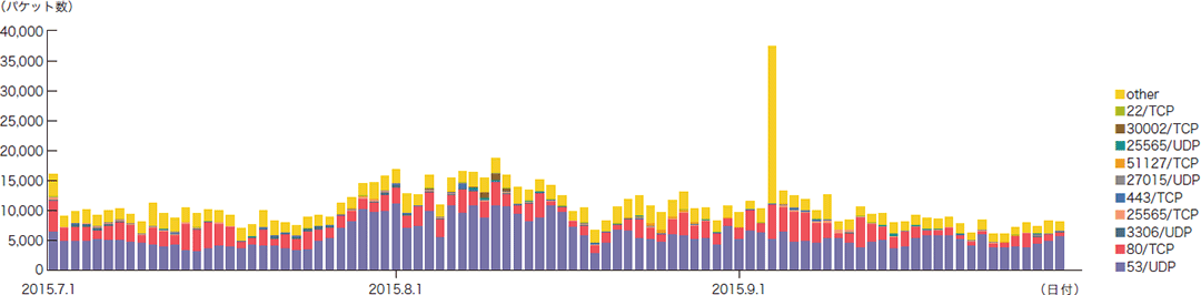 2015年7月から9月の間に観測したbackscatterについて、発信元IPアドレスの国別分類を図-3に、ポート別のパケット数推移を図-4にそれぞれ示します。