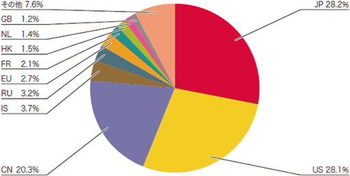 攻撃元の分布としては、多くの場合、国内、国外を問わず非常に多くのIPアドレスが観測されました。これは、IPスプーフィング(※31)の利用や、DDoS攻撃を行うための手法としてのボットネット(※32)の利用によるものと考えられます。