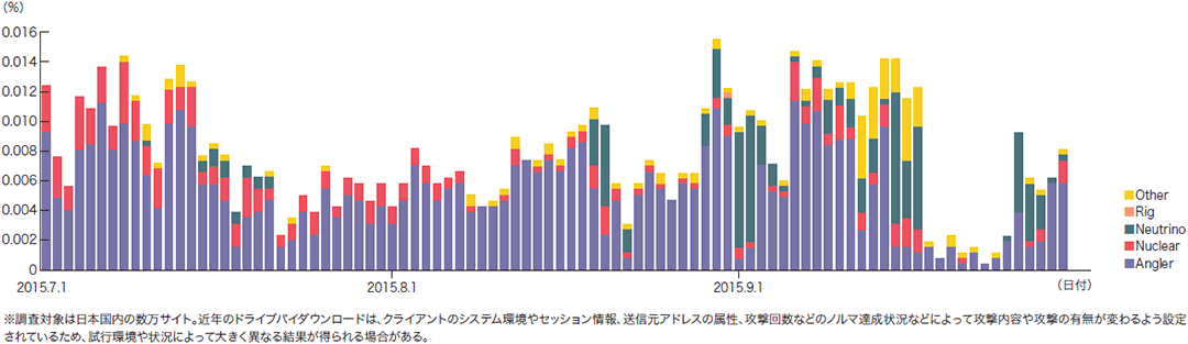 2015年7月から9月の期間は、Anglerが猛威を振るいました(図-12)(※44)。ドライブバイダウンロード攻撃の総数は、2015年4月から6月に集計した値に比べて10倍近くになっています。期間を通じて、攻撃の大部分をAnglerが占めていますが、8月下旬には、それまでAnglerを用いていた攻撃主体が、一部でNeutrinoを用いるようになりました。以降は、同じ改ざんWebサイトから、タイミングなどによりAnglerとNeutrinoのいずれかのExploitKitによる攻撃が観測されるようになりました。日ごとにこの両者の比率が変動する様子は、攻撃主体が複数の攻撃ツールを天秤にかけているようにも見えます。