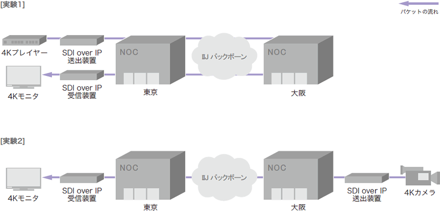 実験2は、全区間にインターネット網を使用したことが特色です。産学協同プロジェクトであるサイバー関西プロジェクト(CKP)の協力を得て、送出機材を大阪に設置しました。CKP内部のネットワークを通り、IIJのバックボーンを大阪から東京へと経由したのち、IIJオフィスで4K映像を出力しました。これらの通信は、グローバルIPv4アドレスを用いて行われました。実際には軽微なパケットロスが観察されましたが、技術的には問題なくカバーできることが確認できています。