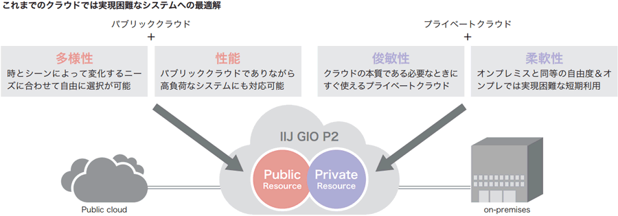 こうした悩みを解決すべく、P2のサービスメニューは、大規模な仮想化基盤からなるパブリックリソースと、テナントごとにデバイスを占有できるベアメタルサーバやストレージから構成されたプライベートリソースと呼ばれる2つのサービス体系から構成されています。用途によってはどちらかのリソースだけを利用するでしょうが、両者を任意に組み合わせて1つのシステムを構成することも可能です。パブリックリソースとプライベートリソースを合わせてP2という1つのクラウドサービスなのです(図-1)。