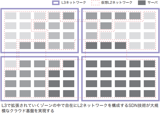 例えば、数百台のサーバから構成されたシステムは従来であれば十分大規模と言えましたが、クラウド基盤としてはいささか小規模です。そうした桁違いの規模のサーバやストレージをネットワークで結び、巨大なリソースプールとして扱う環境というのは、クラウド基盤以外にはなかなかありません。巨大であるということは、通常想定されている様々な上限を超える可能性があるということです。それはVLANの最大数だったり、学習可能なMACアドレスの最大数だったり、帯域だったりと様々ですが、いずれにしても単一の物理デバイスが想定している規模を容易に超える規模であり、SDNを導入し、ソフトウェアで制御しなければ実現し得ないのです。