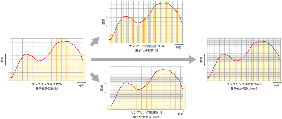 時間軸方向を細かくすることはサンプリング周波数を上げることに、階段の大きさを細かくすることは量子化ビット数を上げることに相当しますので、左側の基準の波形をCDやDATと仮定すると、サンプリング周波数か量子化ビット数のいずれかが基準であるCDやDATを上回っていれば分解能が上がりますのでハイレゾということになります。逆に、いずれかが基準であるCDやDATを下回っているものはハイレゾとは言わないということです。