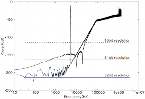 図-3は、SA-CDに採用されたCDの64倍のサンプリングレートの2.8224MHzのDSDの特性例です。固定のフォーマットでありながら、ΔΣ変調の設計次第で20kHz以下のダイナミックレンジを重視した特性(実線)や、聴覚感度を考慮して可聴帯域のダイナミックレンジを重視した特性(破線)にすることができるという自由度の高さを示しています。また、図-3の赤線を参照していただくと、どちらも可聴帯域内で24ビットを超える分解能を持っていることがお分かりいただけるかと思いますが、このように量子化ビット数に分解能が制限されない点もアナログ信号と似通っていて、オーディオ用途として大変重要なポイントだと思います。
