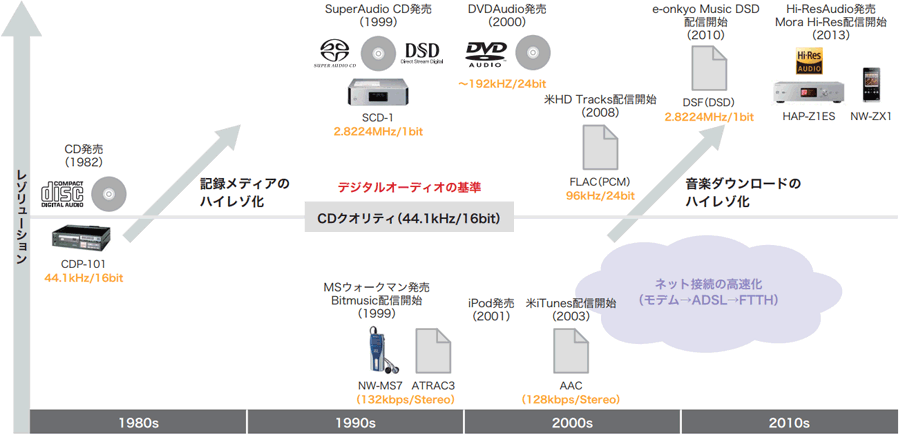これに呼応して高音質ファイル再生PCアプリケーションやオーディオマニア向けのUSB-DACが次々に市場導入されるようになり、日本でも2010年7月からe-onkyo musicがDRMフリーの「ハイレゾ」配信を開始しました。e-onkyo musicも当初はCDクオリティー(16bit)のファイルを配信していたのですが、ダウンロード数はハイレゾが圧倒的という状況からハイレゾ配信に注力するようになり、2013年5月にはCDクオリティーの配信を終了し、以降、ハイレゾ配信に特化したサイトとして音源の充実を図ってきています。