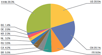 図-3で、DDoS攻撃の対象となったIPアドレスと考えられるbackscatterの発信元の国別分類を見ると、米国の20.5%が最も大きな割合を占めています。その後に中国の20.1%、フランスの9.0%といった国が続いています。