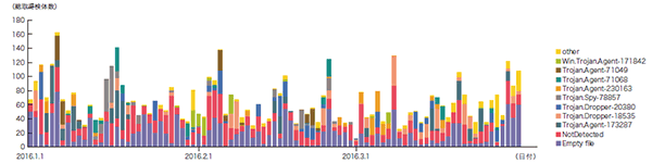 ダウンロードされるマルウェアは当初CryptoWall4.0が大部分を占めていましたが、2月中旬頃からTeslaCrypt3.0が取って代わりました。その他にNecurs、Bedep、Locky、Andromedaなどを検知しましたが、いずれも少数でした。特にLockyは同時期にメール経由での感染で大規模に拡散しているランサムウェアでしたが(※42)(※43)、ドライブバイダウンロードのペイロードとして検知したものは極めて少数で、期間も短いものでした。
