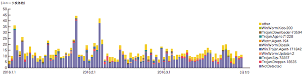 期間中の1日あたりの平均値は、総取得検体数が91、ユニーク検体数が14でした。未検出の検体をより詳しく調査した結果、台湾などに割り当てられたIPアドレスでWorm(※35)や、インドに割り当てられたIPアドレスでトロイの木馬(※36)などが観測されています。