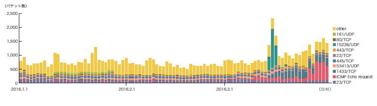 2016年1月から3月の間に観測したbackscatterについて、発信元IPアドレスの国別分類を図-3に、ポート別のパケット数推移を図-4にそれぞれ示します。