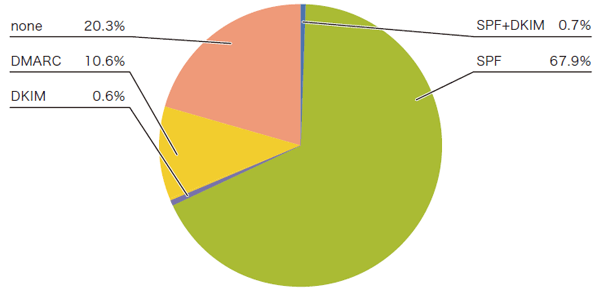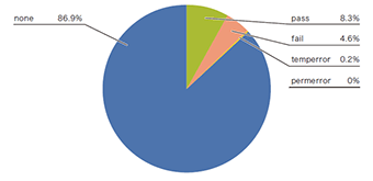 図-6のDKIMの認証割合では、「none」以外の導入割合は20.1%でした。同様に前回からは8.5%伸びており、もともと送信側の導入にコストがかかるDKIMの導入率は低かったわけですが、それでもこちらも少しずつ導入割合が伸びていることが分かります。これらSPFあるいはDKIMを導入していることが、DMARC導入の前提となるのすが、図-4に示したとおり、DMARCでの認証ができなかった「none」以外の割合、すなわちDMARCの導入割合は、13.1%です。DMARCは、SPFあるいはDKIMを導入していれば、"_dmarc"サブドメインのTXT資源レコードにDMARCレコードを記述するだけで導入できますので、SPF及びDKIMより導入割合が低かったということは、まだDMARCに対する認知度が低いと考えられます。今後も、DMARCの利点及び導入方法について働きかけを行う必要があると考えます。