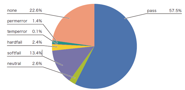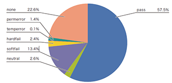 もう1つ、図-4のDMARCの認証割合で特徴的なのが、認証結果「fail」の割合が4.6%と高いことです。メールの転送時に認証が失敗しやすいSPFでは、予めそうした事象が想定される場合に「softfail」とやや弱めの失敗結果となるようにSPFレコードを宣言する傾向があります。そのため、SPFで「softfail」となる割合が13.4%と多いことは想定可能です。しかしながら、SPFでより強い認証の失敗結果である「hardfail」の2.4%、DKIMの「fail」の0.7%と比べると、DMARCの認証失敗だった4.6%はとても高い割合と言えます。この要因については、次節で分析します。