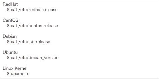 Volatilityのプロファイルを生成するには、メモリイメージの解析対象となるシステムと同じバージョンのシステムにVolatilityをインストールする必要があります。主なLinuxディストリビューションでのOSバージョンとLinux Kernelのバージョンを確認する方法は図-15を参照してください。なお、今回は、CentOS Linux 7.2-1511、Linux Kernel 3.10.0- 327.22.2.el7.x86_64を例に解説します。