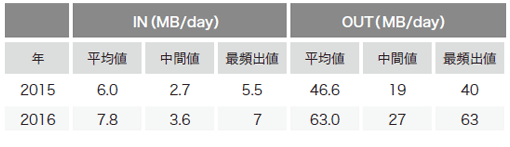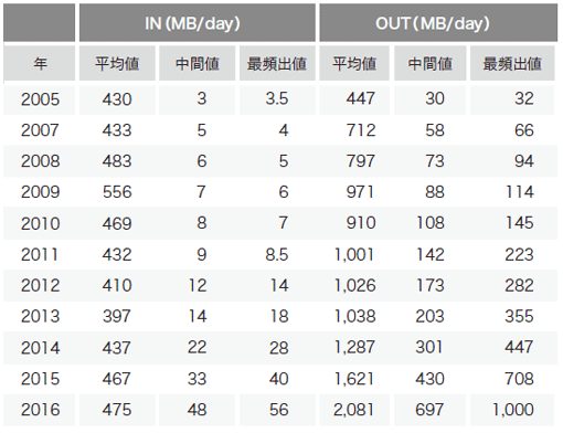 表-1は、ブロードバンド利用者の1日のトラフィック量の平均値と中間値、分布の山の頂点にある最頻出値の推移を示します。分布の山に対して頂点が少しずれているので、最頻出値は分布の山の中央に来るように補正しています。分布の最頻出値を2015年と2016年で比較すると、INでは40MBから56MBに、OUTでは708MBから1000MBに増えていて、伸び率で見ると、INとOUT共に1.4倍になっています。一方、平均値はグラフ右側のヘビーユーザの使用量に引っ張られるので、2016年には、INの平均は475MB、OUTの平均は2081MBと、最頻出値よりかなり大きな値になります。2015年には、それぞれ467MBと1621MBでした。