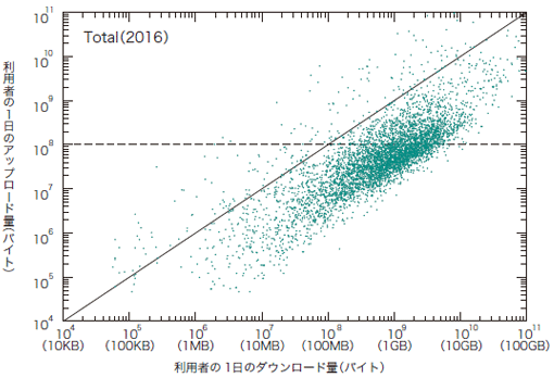 モバイルでは、表-2に示すように、ヘビーユーザが少ないため、平均と最頻出値がほぼ一致します。2016年の最頻出値は、INで7MB、OUTで63MBで、平均値は、INで7.8MB、OUTで63.0MBです。最頻出値の伸び率は、INで1.3倍、OUTで1.6倍となっています。図-4及び図-5は、利用者ごとのIN/OUT使用量を5,000人をランダムに抽出してプロットしています。X軸はOUT(ダウンロード量)、Y軸はIN(アップロード量)で、共にログスケールです。利用者のIN/OUTが同量であれば対角線上にプロットされます。対角線の下側に対角線に沿って広がるクラスタは、ダウンロード量がひと桁多い一般的なユーザです。ブロードバンドでは、以前は右上の対角線上あたりを中心に薄く広がるヘビーユーザのクラスタがはっきり分かりましたが、今では識別ができなくなっています。また、各利用者の使用量やIN/OUT比率にも大きなばらつきがあり、多様な利用形態が存在することが窺えます。ここでは、2015年と比較しても、ほとんど違いは確認できません。