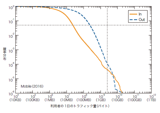 ブロードバンドのINとOUTの各分布は、片対数グラフ上で正規分布となる、対数正規分布に近い形をしています。これはリニアなグラフで見ると、左端近くにピークがあり右へなだらかに減少するいわゆるロングテールな分布です。OUTの分布はINの分布より右にずれていて、ダウンロード量がアップロード量より、ひと桁以上大きくなっています。2015年と2016年で比較すると、INとOUT共に分布の山が右に少し移動していて、利用者全体のトラフィック量が増えていることが分かります。右側のOUTの分布を見ると、分布のピークはここ数年間で着実に右に移動していますが、右端のヘビーユーザの使用量はあまり増えていないので、分布の対称性が崩れてきています。一方で、左側のINの分布は左右対称で、より対数正規分布に近い形です。