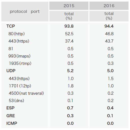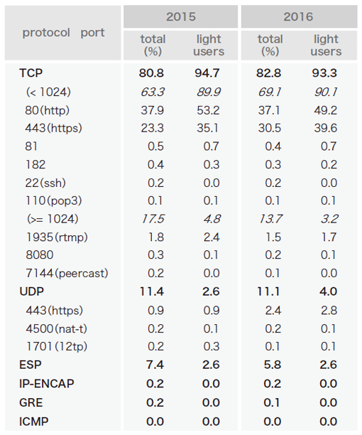 表-3はブロードバンド利用者のポート使用割合を、全体とライトユーザについて、2015年と2016年で比較したものです。2016年の全体トラフィックの83%はTCPです。HTTPの80番ポートの割合が、2015年の38%から37%に減って、HTTPSの443番ポートの割合が、23%から31%に増えています。減少傾向のTCPの動的ポートは、2015年の18%から2016年には14%にまで減りました。動的ポートでの個別のポート番号の割合は僅かで、Flash Playerが利用する1935番が最大で総量の約2%ありますが、後は0.5%未満となっています。TCP以外のトラフィックでは、UDPでもHTTPSの443番ポートのトラフィックがあり、GoogleのQUICプロトコルだと思われます。他はほとんどVPN関連です。