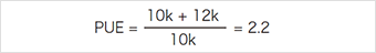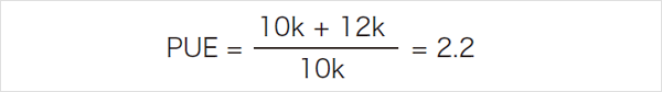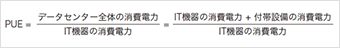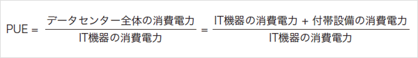 データセンターは同一箇所に多数のサーバを収容するためスケールメリットが発生します。これは、付帯設備を共有できることや付帯設備自体を効率の良い規模で運用できることに由来しており、データセンター以外の環境と比較して効率が良い状態を維持できます。データセンターの効率を表現するための指標としてPUE(Power Usage Effectiveness)という指標がつかわれることがあります。PUEは次の式で定義されます。