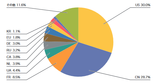 図-3で、DDoS攻撃の対象となったIPアドレスと考えられるbackscatterの発信元の国別分類を見ると、米国の30.0%が最も大きな割合を占めています。その後に中国の28.7%、フランスの8.5%といった国が続いています。