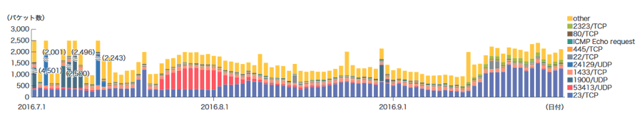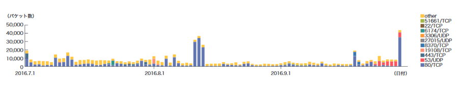 2016年7月から9月の間に観測したbackscatterについて、発信元IPアドレスの国別分類を図-3に、ポート別のパケット数推移を図-4にそれぞれ示します。