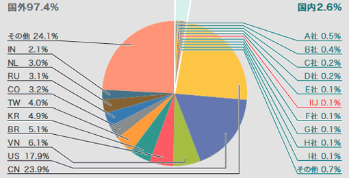 攻撃元の分布としては、多くの場合、国内、国外を問わず非常に多くのIPアドレスが観測されました。これは、IPスプーフィング(※33)の利用や、DDoS攻撃を行うための手法としてのボットネット(※34)の利用によるものと考えられます。
