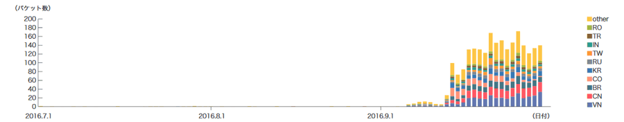 また9月に入ってからは、2323/TCPのアクセスが増加しています。図-7に2323/TCPの国別のアクセス数を示します。7月、8月にはほとんど通信が発生していないのに対し、9月6日に増加し始め、9月14日以降に急増しているのが分かります。Miraibotは10回に1回の割合で、2323/TCPに通信する特徴があることが知られており、増加し始めた時期と合わせると、これらのほとんどはMiraibotによるものと考えられます。国別に見ると、ベトナム、中国、ブラジル、コロンビア、韓国など、幅広い国に割り当てられたIPアドレスから受信していました。