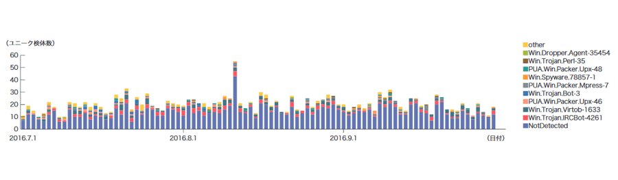 期間中の1日あたりの平均値は、総取得検体数が124、ユニーク検体数が20でした。未検出の検体をより詳しく調査した結果、台湾、インド、ベトナムなどに割り当てられたIPアドレスで複数のSDBOTファミリ(IRCボットの一種)やビットコインマイニングツールのダウンローダなどが観測されています。