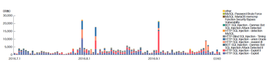 2016年7月から9月までに検知した、Webサーバに対するSQLインジェクション攻撃の発信元の分布を図-11に、攻撃の推移を図-12にそれぞれ示します。これらは、IIJマネージドIPSサービスのシグネチャによる攻撃の検出結果をまとめたものです。発信元の分布では、米国35.7%、中国23.7%、日本9.8%となり、以下その他の国々が続いています。Webサーバに対するSQLインジェクション攻撃の合計値は前回と比べてほぼ横ばいの傾向にありますが、中国は増加傾向、また、日本は減少傾向にあります。