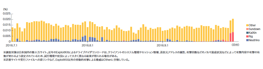 2016年7月から9月までの期間は、検知した受動的攻撃の大部分をNeutrino ExploitKitによるドライブバイダウンロード攻撃が占めました(図-13)。2016年6月にAngler ExploitKitが消滅して以来継続していた傾向です。しかし、9月下旬頃にはNeutrinoは一切観測されなくなり、代わりにRig ExploitKitが大規模に観測されるようになりました(※55)(※56)。これらのペイロードとしては、Locky、Cerber、Ursnifなどを確認しています。