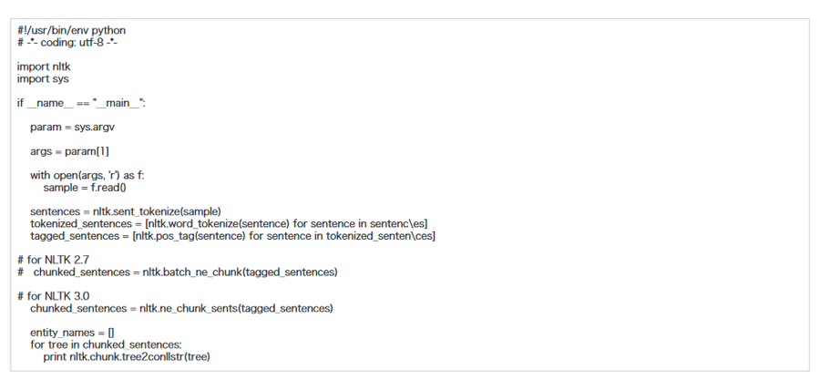 今日ではNatural Language Toolkit(NLTK)にNERが搭載されているので、図-1のようなPythonスクリプトを使って比較的お手軽に固有表現の抽出を試すことができます。